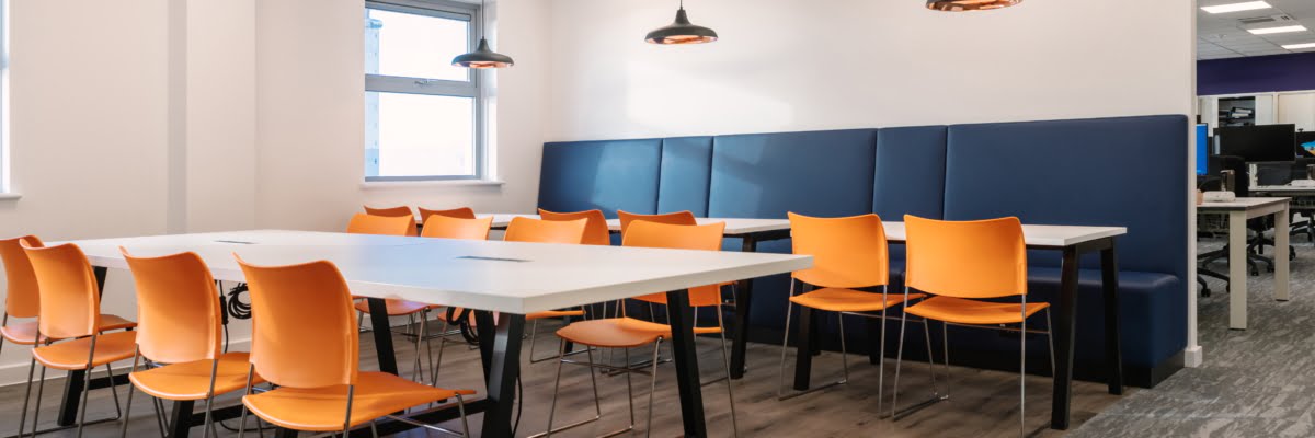 For the main office we chose simple and contemporary desking and storage from The Senator Group. The colourful locker units from Maine Storage Innovation provided a fun way of include the SHW branding whilst also providing a highly functional storage solution. In contrast, the staff breakout space needed a softer approach and this was achieved with industrial A-frame tables from Buronomic and a run of striking banquette seating upholstered in blue vinyl from manufacturer Davison Highley.